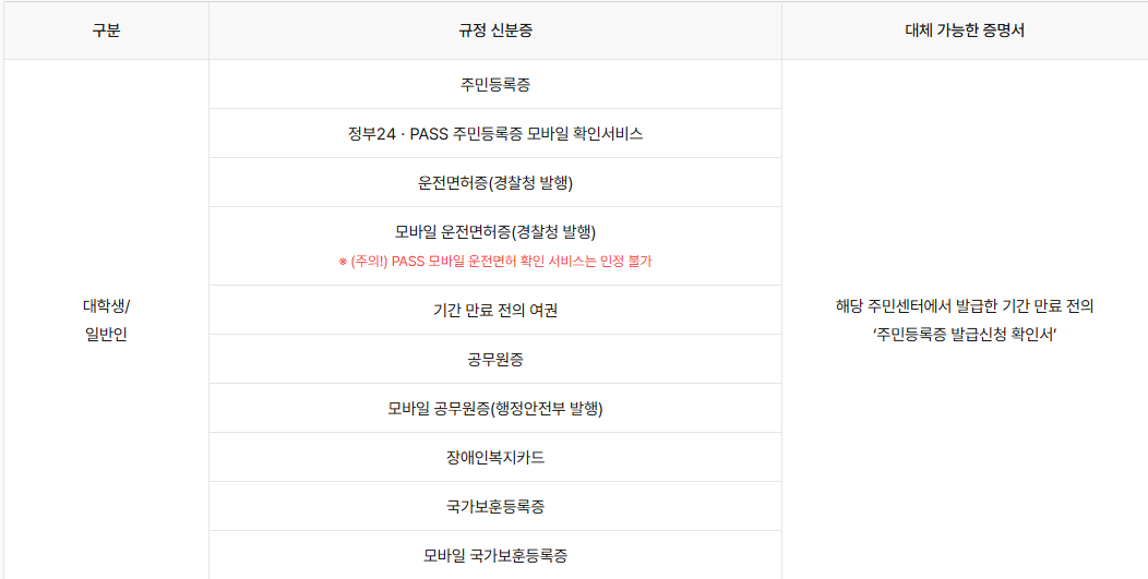 - 신분증 : 본인 확인을 위해 반드시 필요합니다. 주민등록증, 운전면허증, 여권 등 정부에서 발급한 신분증이 유효합니다. 학생증은 인정되지 않으니 주의하세요.