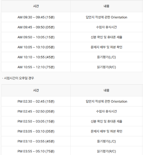 토익 시험은 오전 또는 오후로 나뉘어 진행되며, 응시자는 시험 시작 전에 정해진 절차에 따라 준비해야 합니다. 시험은 크게 오리엔테이션, 신분 확인, 문제지 배부, 듣기 평가(L/C), 읽기 평가(R/C) 순서로 진행됩니다.